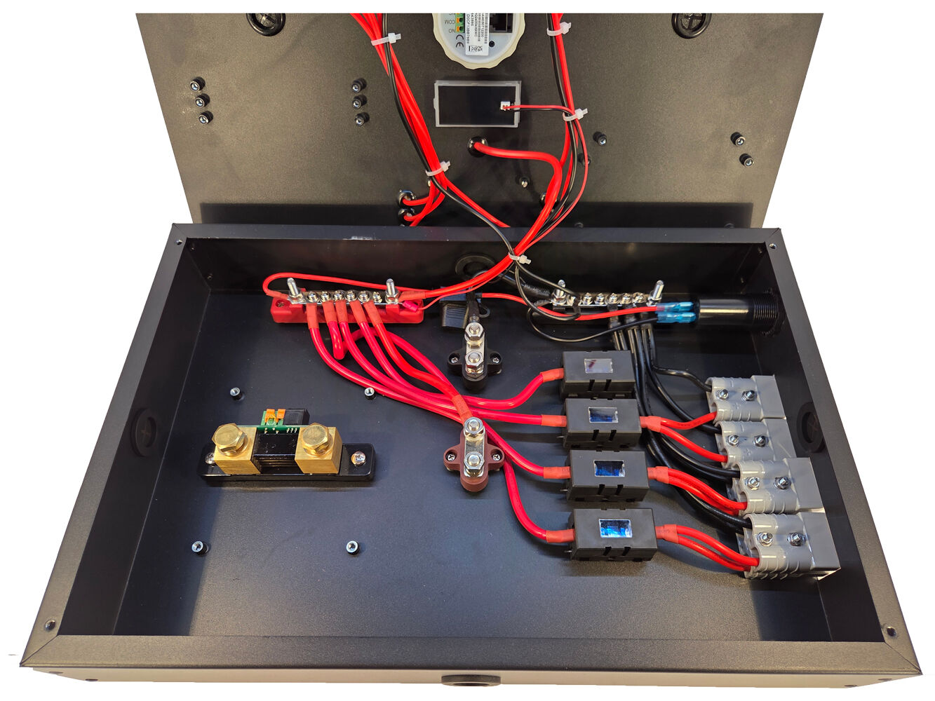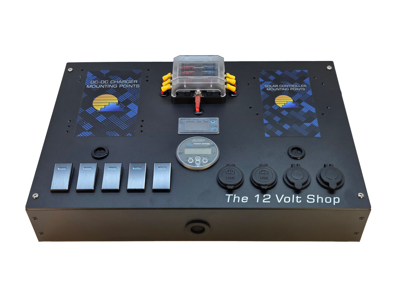 Visual data, right on the lid. This Control Hub features the legendary Victron BMV-712 Smart Battery Monitor fully installed. With the display screen mounted externally on the front lid and the shunt wired internally, you get at-a-glance voltage and battery percentage data the moment you open your canopy, plus full Bluetooth connectivity. The professional choice for total power control. 5 Year Warranty on the SmartShunt