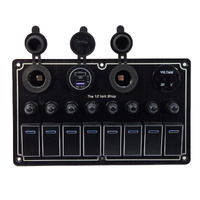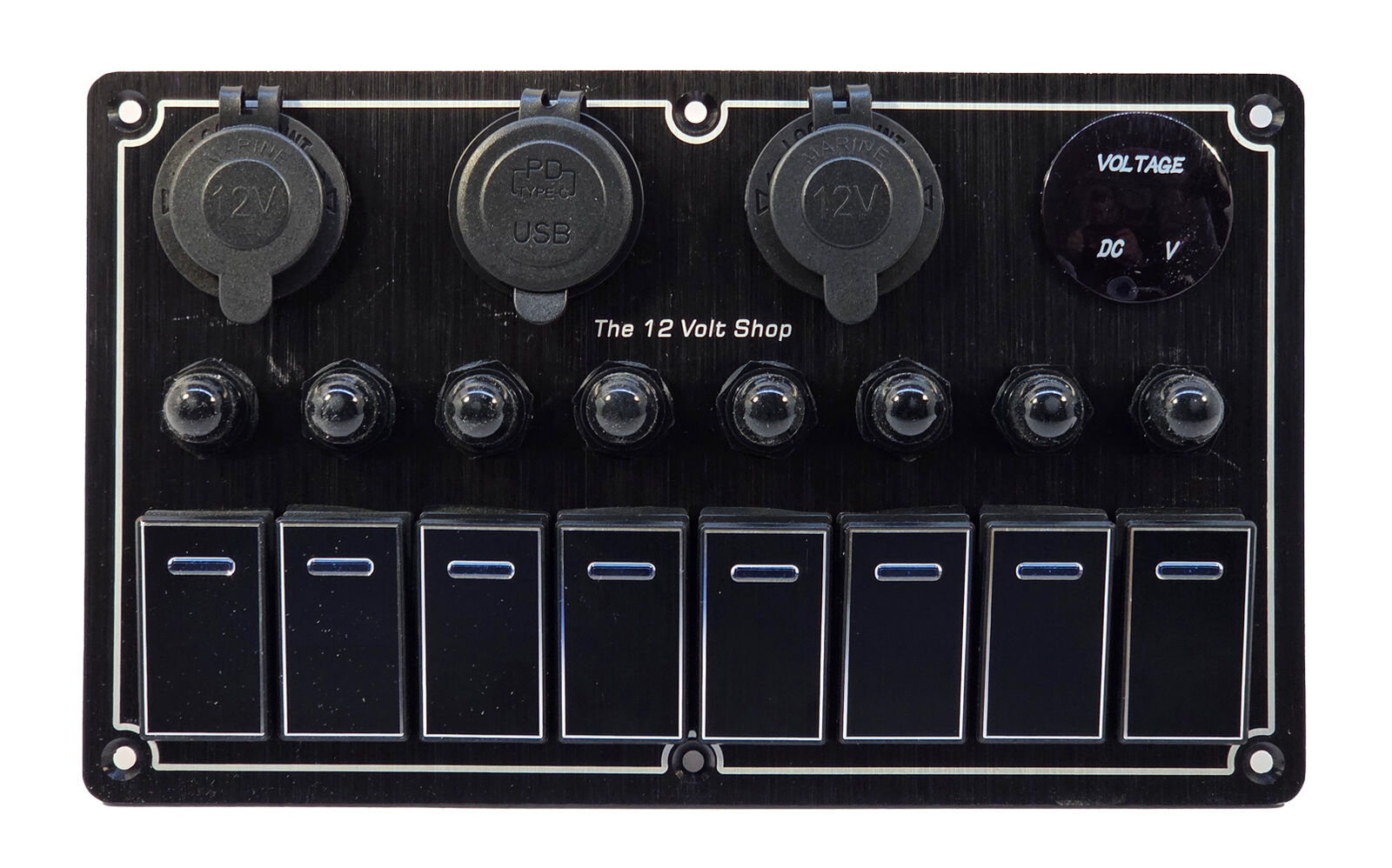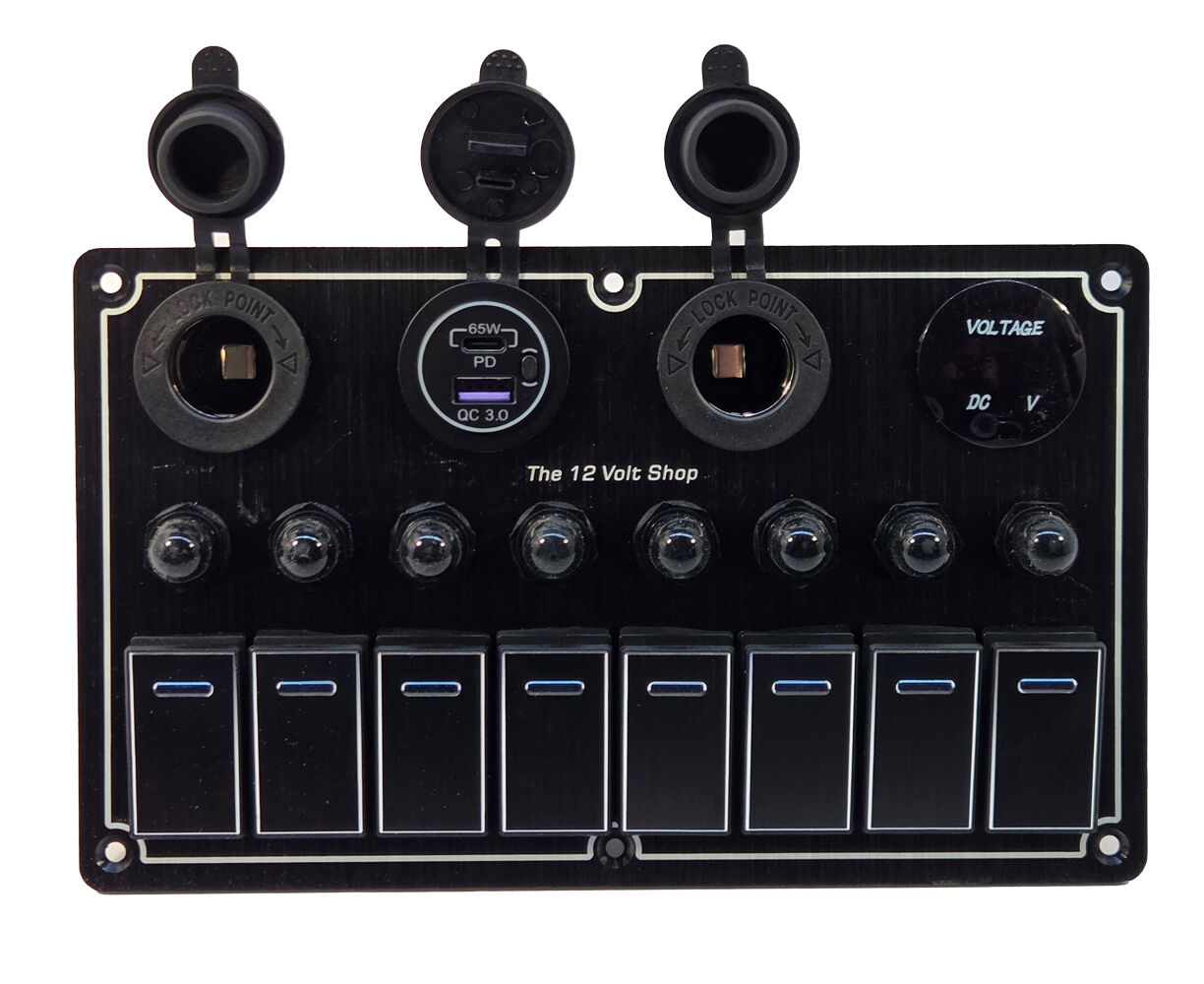 8 Gang Aluminium Switch Panel With Voltmeter, 2 x 12V Accessory Socket and 83W Dual USB-A/C