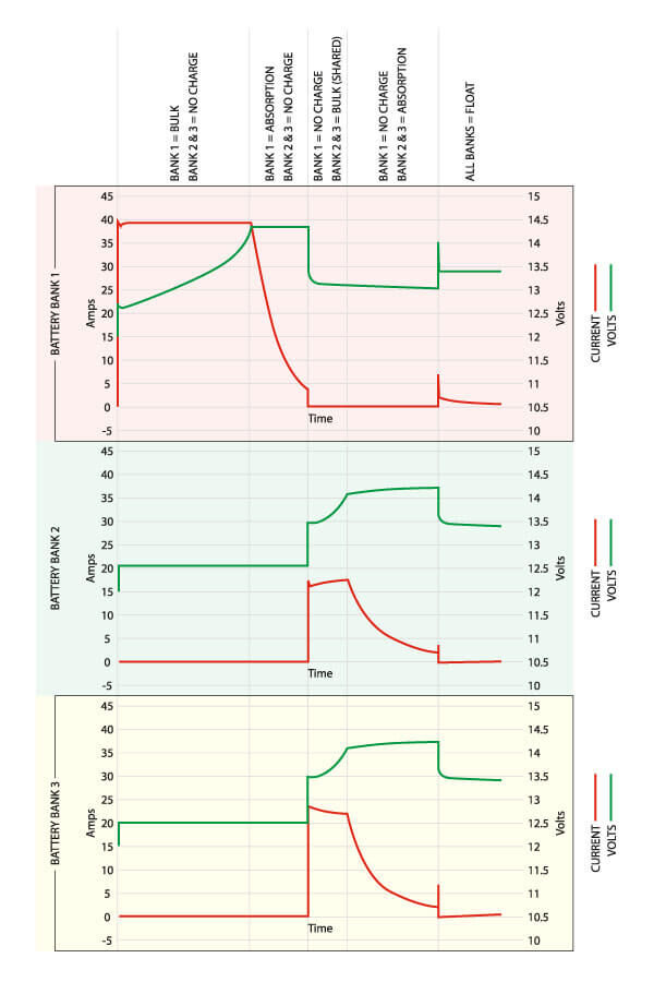 The ePOWER 20A Battery Charger delivers a priority charge to Bank 1, or your main house battery bank which allows the charger to get this bank recharged the quickest, then transition the cycle to the lesser bank 2 & 3 batteries.