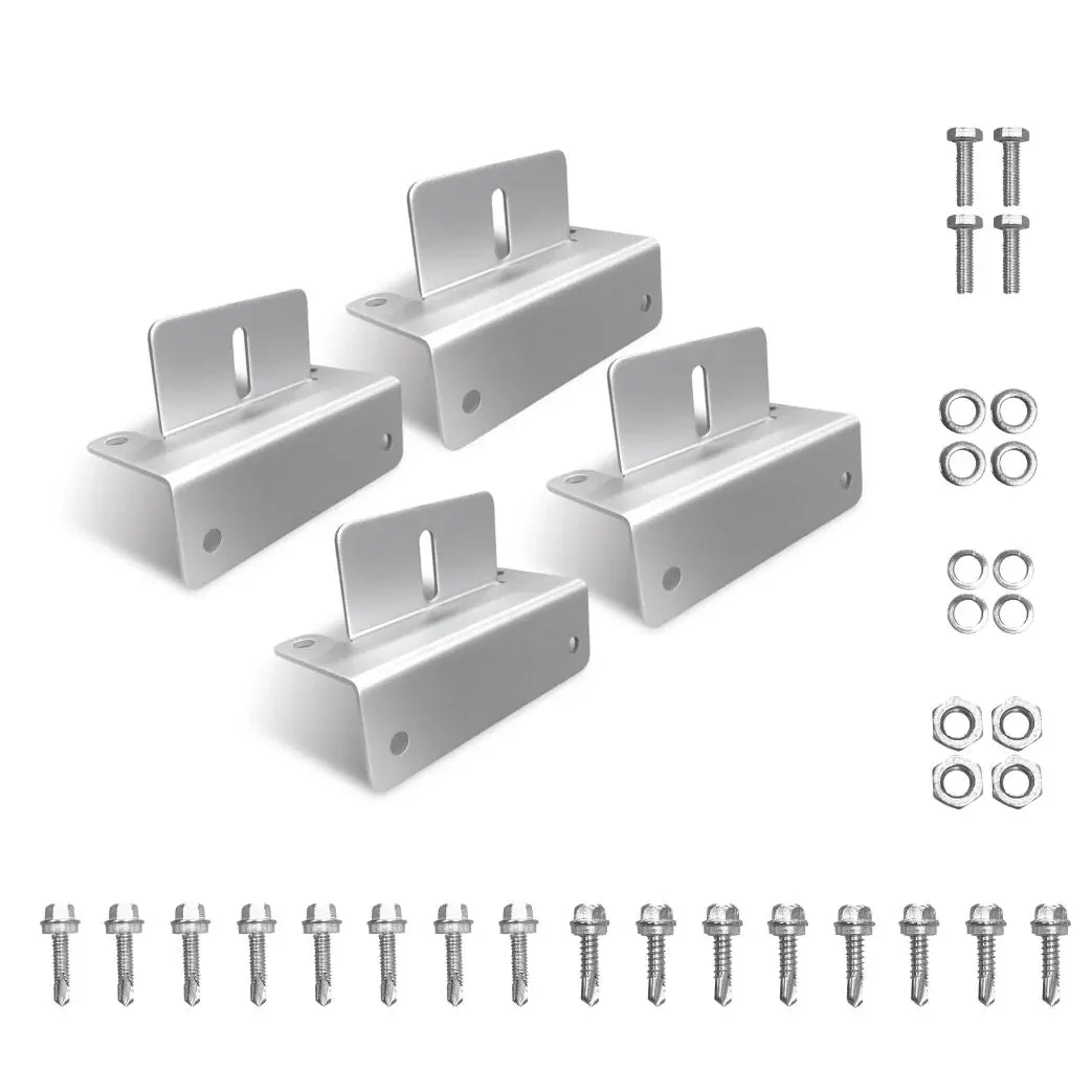 Our solar panel brackets come complete with all necessary hardware for a seamless installation, including 4 stainless bolts, washers and nuts and 16 Silver tech screws.