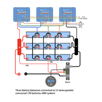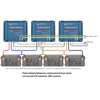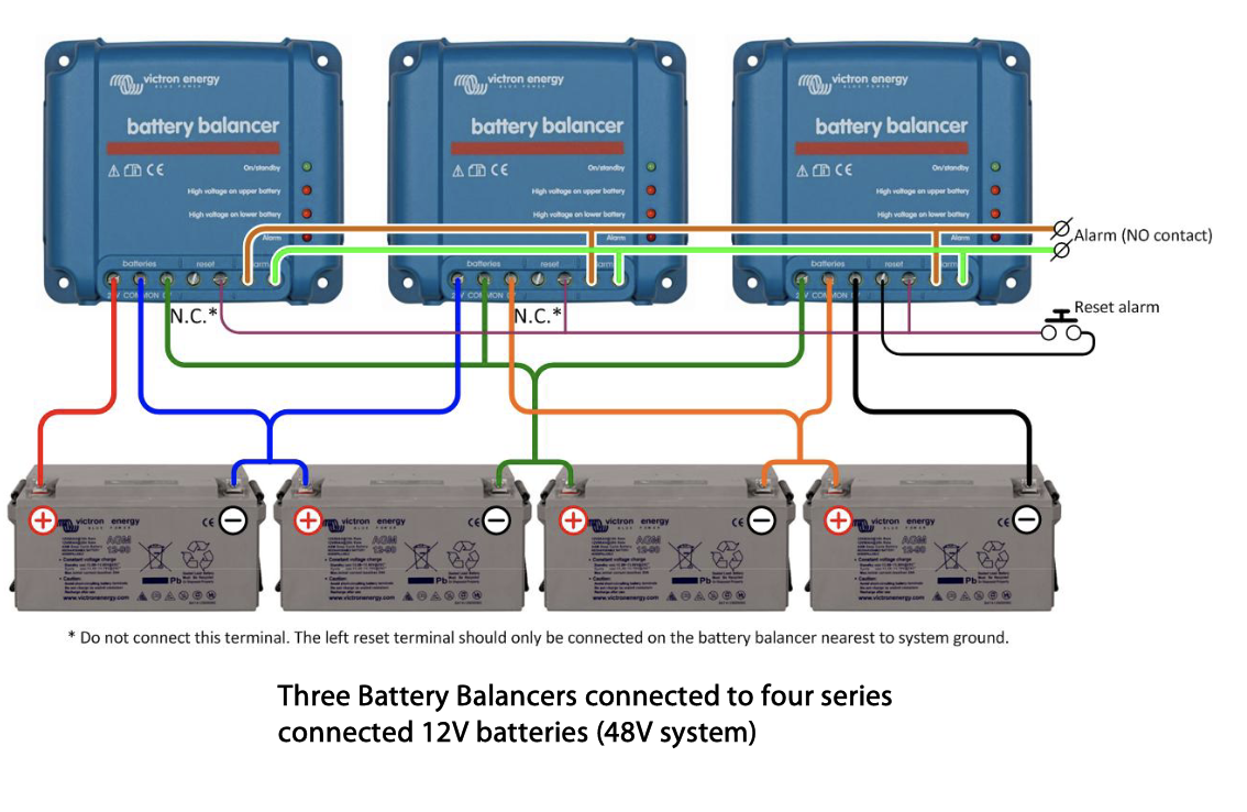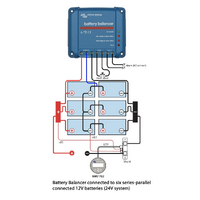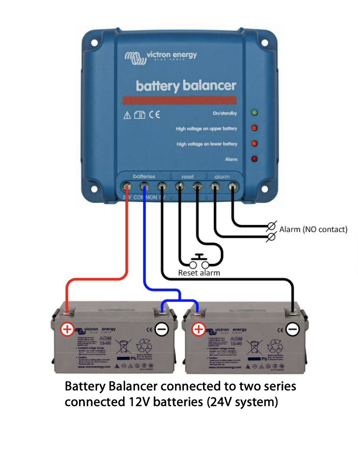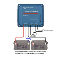 The Battery Balancer equalizes the state of charge of two series connected 12V batteries, or of several parallel strings of series connected batteries. When the charge voltage of a 24V battery system increases to more than 27,3V, the Battery Balancer will turn on and compare the voltage over the two series connected batteries. The Battery Balancer will draw a current of up to 0,7A from the battery (or parallel connected batteries) with the highest voltage. The resulting charge current differential will ensure that all batteries will converge to the same state of charge.