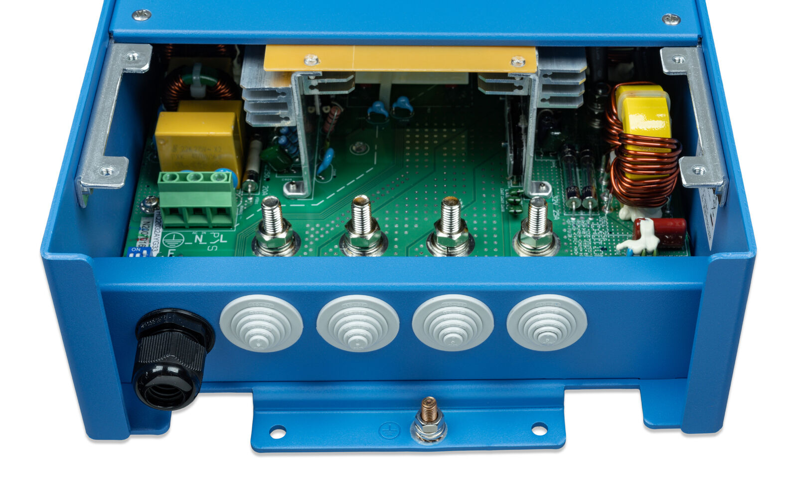 Aluminium epoxy powder coated cases with drip shield and stainless steel fixings withstand the rigors of an adverse environment: heat, humidity and salt air. Circuit boards are protected with an acrylic coating for maximum corrosion resistance. Temperature sensors ensure that power components will always operate within specified limits, if needed by automatic reduction of output current under extreme environmental conditions.