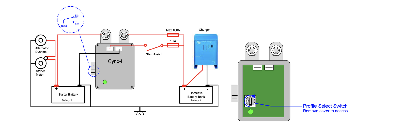 The Cyrix can also be engaged with a push button (Cyrix remains engaged during 30 s) or a switch to connect batteries in parallel manually. This is especially useful in case of emergency when the starter battery is discharged or damaged.