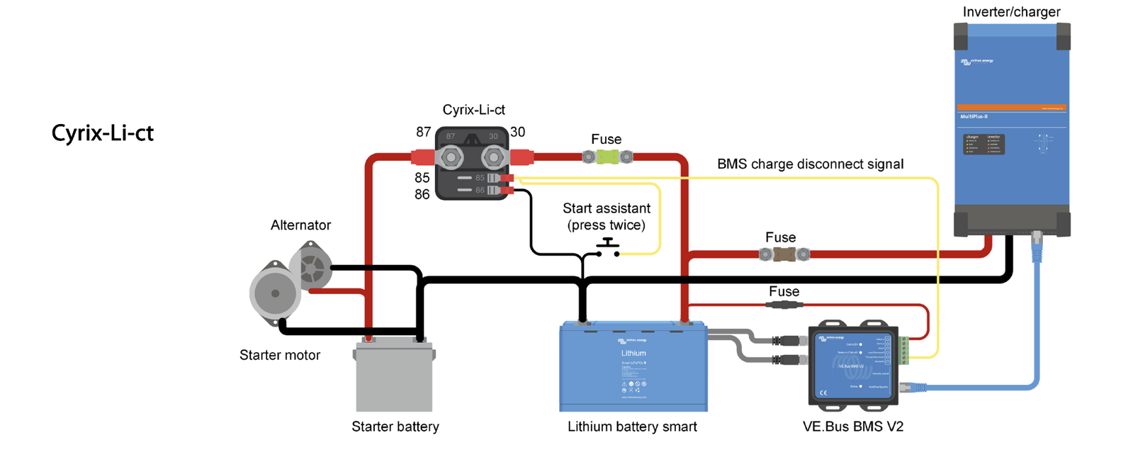 The functionality of the Cyrix-Li-ct is analogous to the Cyrix-ct. The Cyrix-Li-ct will parallel connect a lead acid starter battery and a LiFePO4 battery: